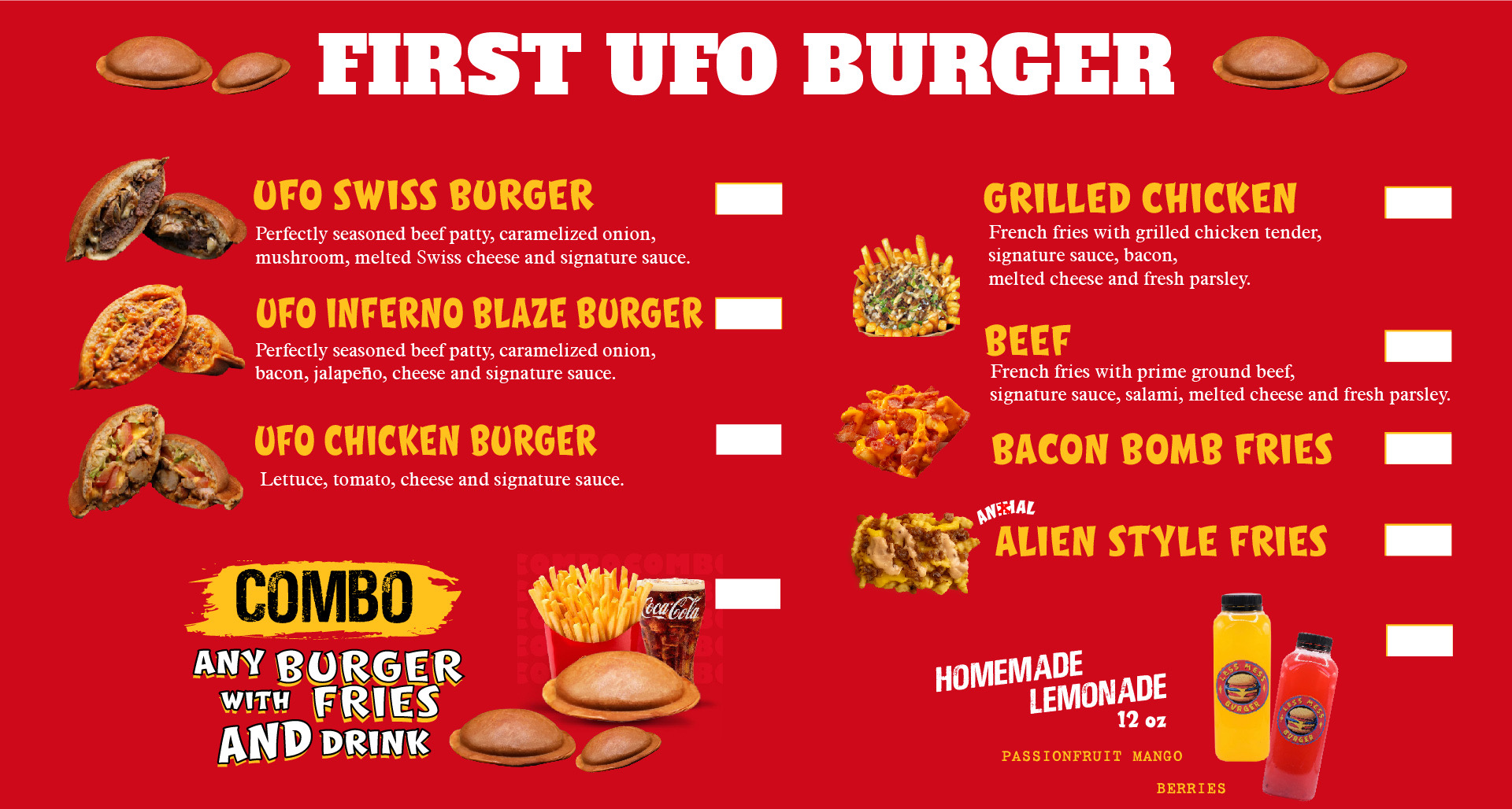 Our menu has something for everyone — from our iconic UFO Swiss Burger, the ultimate blend of melted Swiss cheese, caramelized onions, and signature sauce, to our fiery Inferno Blaze, classic regular burgers, and vegan and veggie UFO burgers made with the same mouth-watering flavor. And don’t miss our homemade lemonades, crafted fresh with real fruit for a perfect, refreshing finish.