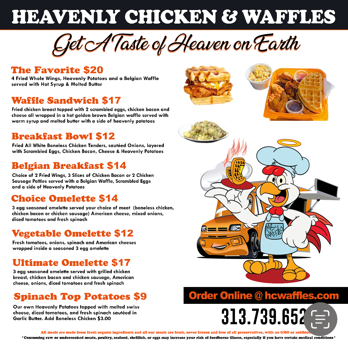 At Heavenly Chicken & Waffles, all our meals are freshly made to order, ensuring you enjoy only the highest quality dishes. Our menu is designed to cater to a variety of tastes, with each entrée crafted to offer a little taste of heaven on earth.